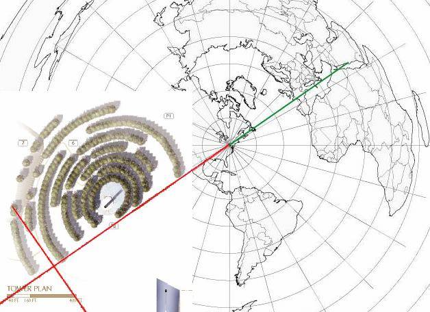 Eaotin's true-Mecca-line graphic, with Tower of Voices site-plan superimposed.